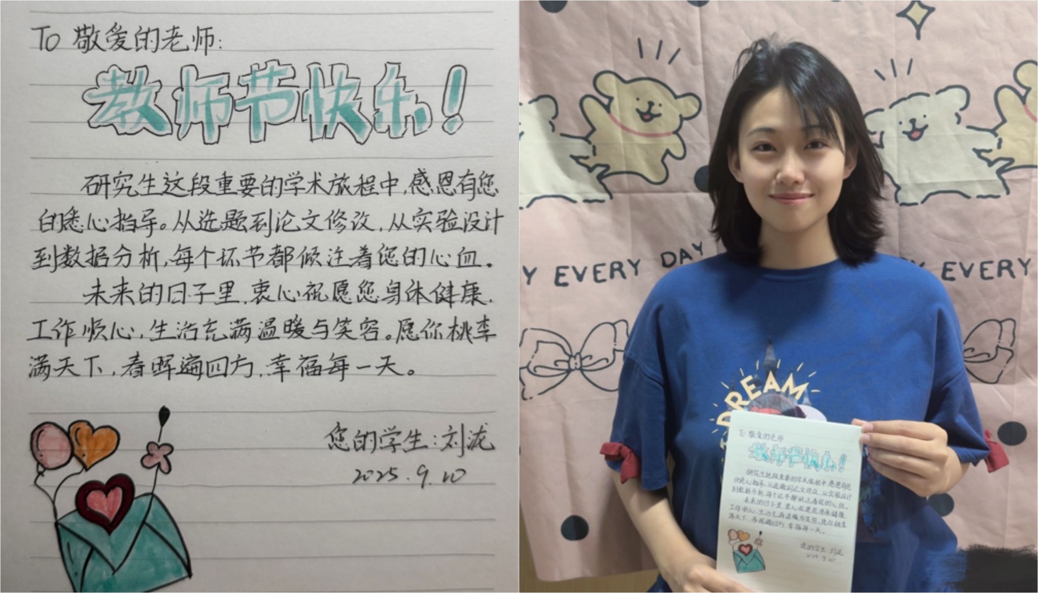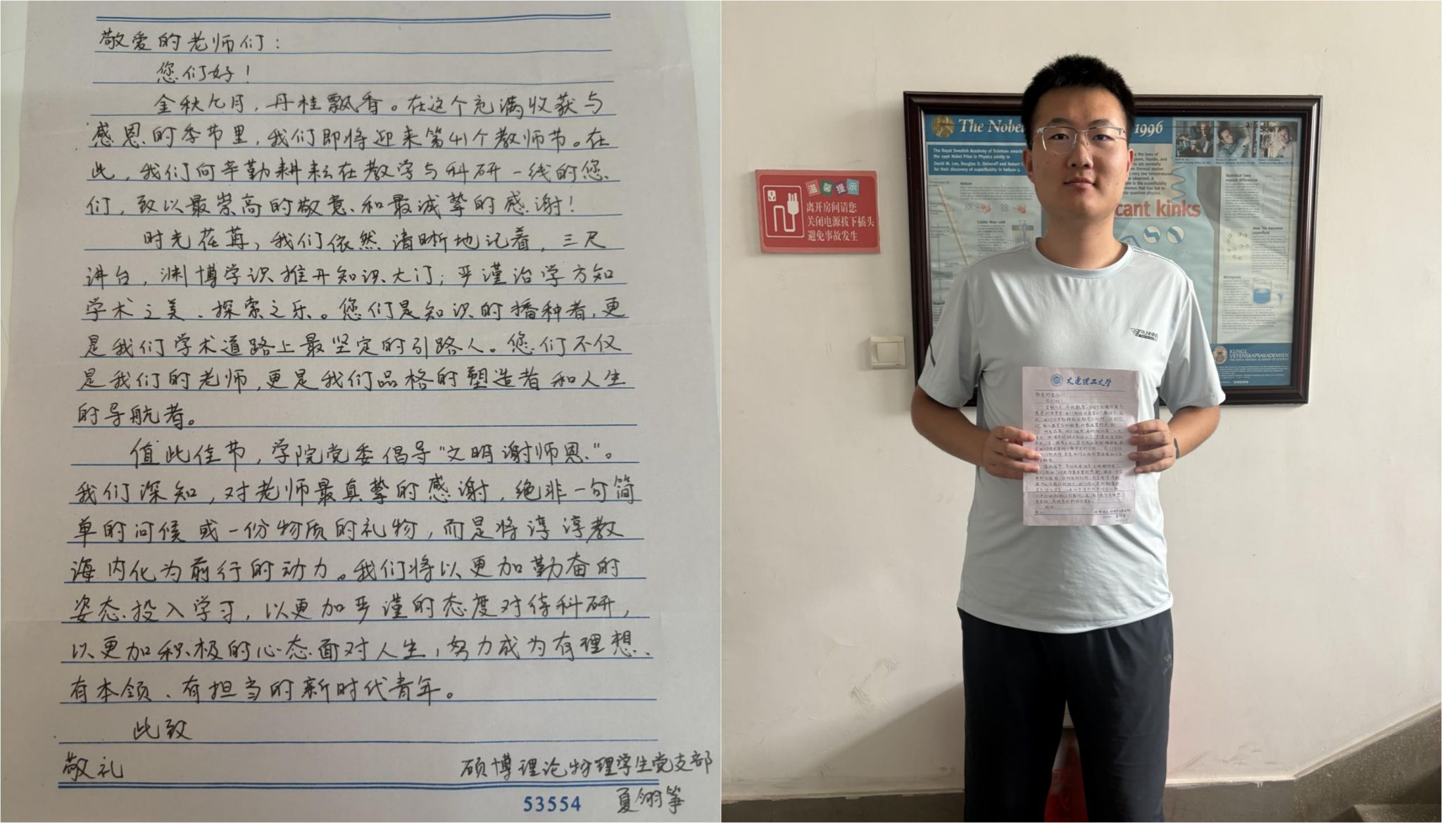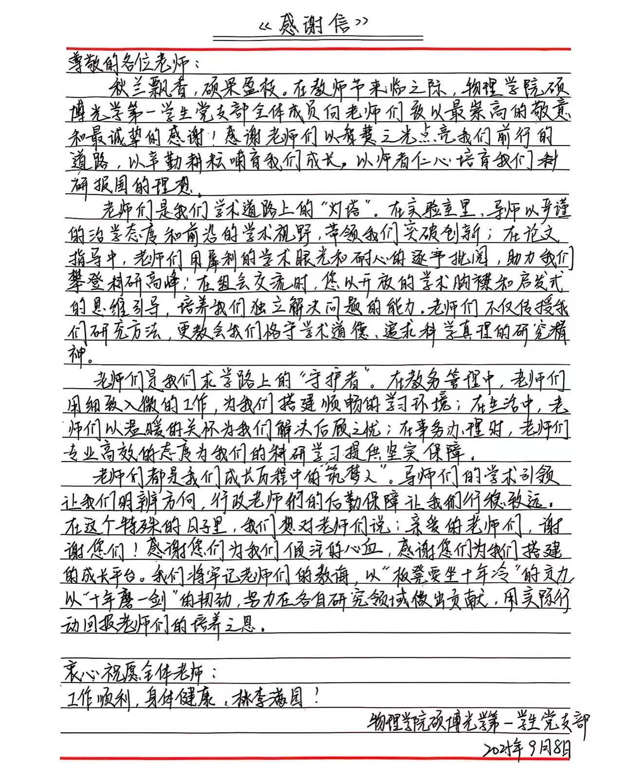 硕博等离子体第一学生党支部的刘泷同学在感谢信中不仅表达了对导师们辛勤付出的感激,更以桃李满园、身体健康的美好祝福折射出师生间深厚的情谊与学术传承的温度。