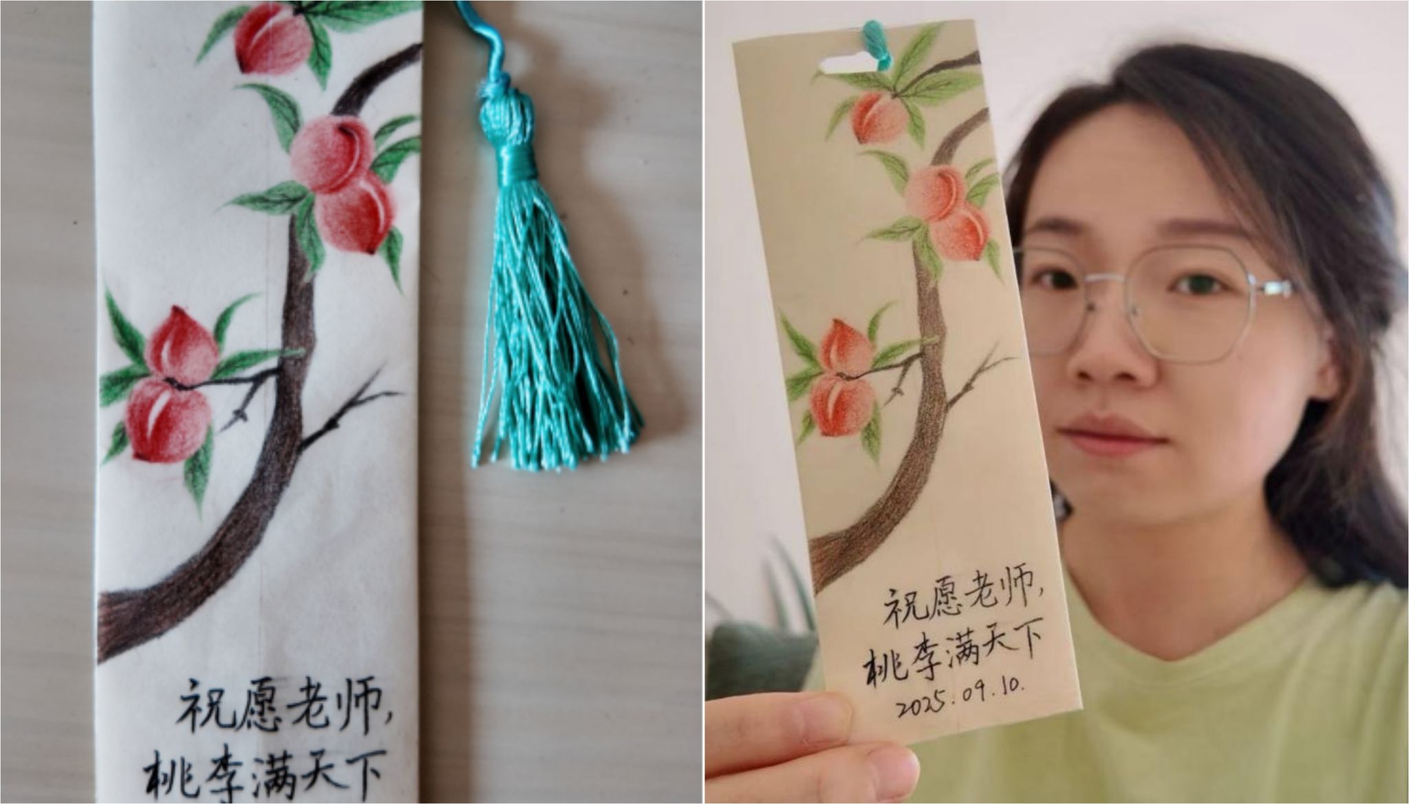 由杨祎嘉同学制作的素雅书签的画面主体是一枝彩铅绘就的桃枝,姿态清雅,枝上结着五颗饱满的桃子,寓意“桃李满天下”。整体布局疏朗,将美好的视觉意象与对师者的感恩祝福融为一体,既简洁又深具意境。