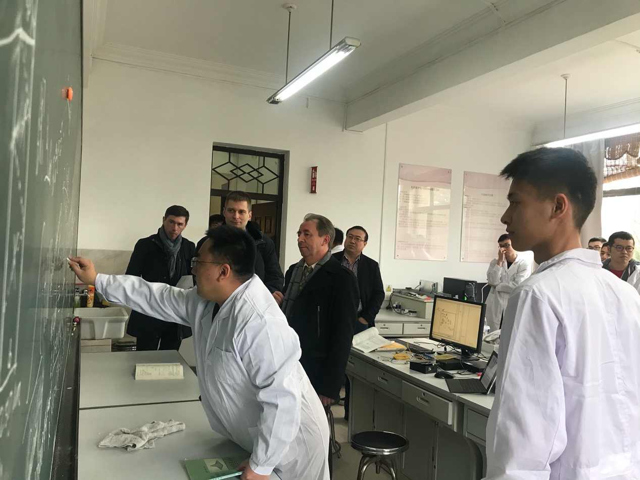 11月21日,白俄罗斯国立大学乐鱼app官网院长M. Tivanov,激光物理和光谱学系主任A. L. Tolstik教授以及中白学院白方副院长M. Denis一行3人来到乐鱼app官网参观实验室并进行调研。乐鱼app官网副院长于长水、中白学院那晓及相关实验室负责人陪同参观交流。