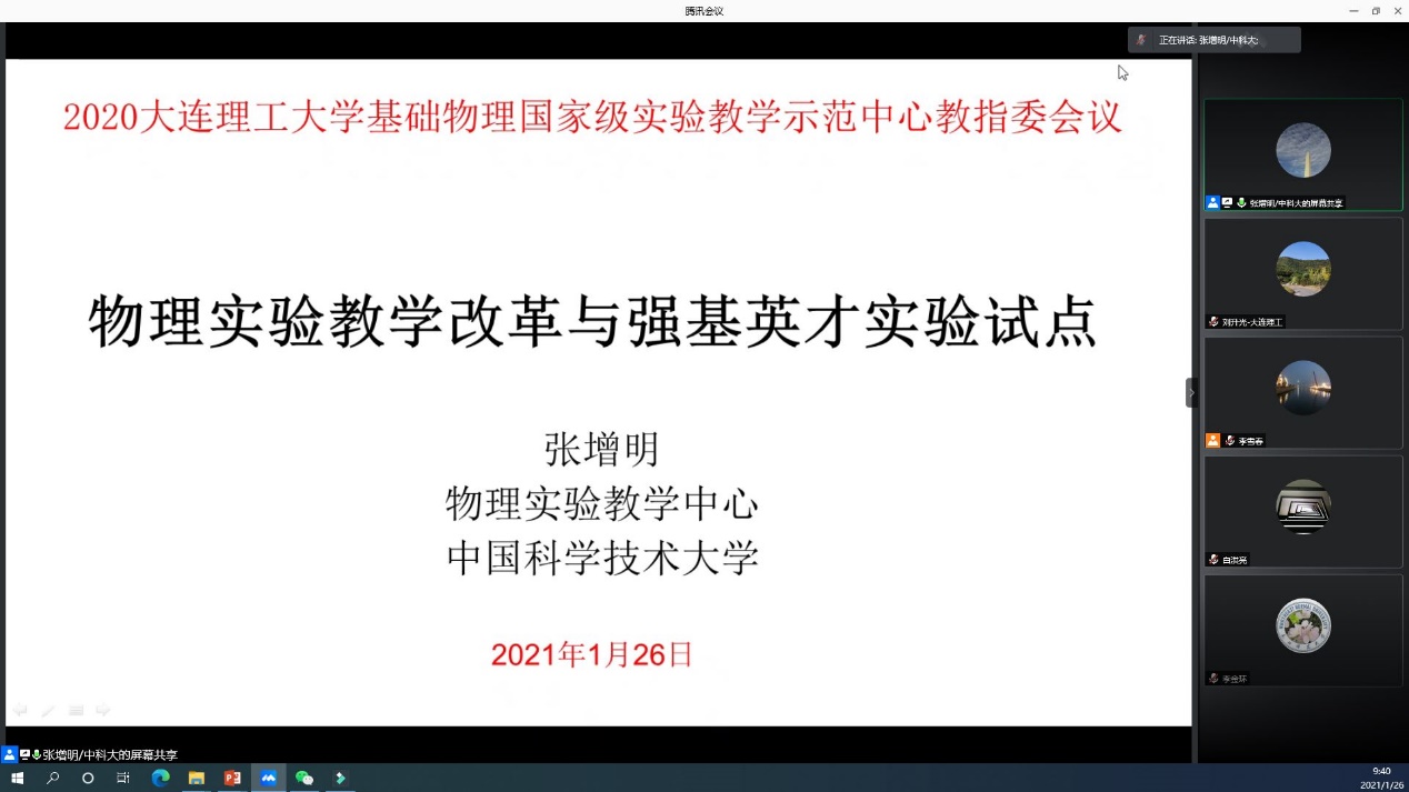 2020年1月26日,基础物理国家级实验教学示范中心(大连理工大学)教学指导委员会2020年年会通过腾讯会议的方式在线上召开。中心教学指导委员会主任、中国科技大学张增明教授、中心教学指导委员会委员华中科技大学熊永红教授、山东大学徐建强教授、东北师范大学李金环教授、大连理工大学余虹教授、大连理工大学李雪春教授以及实验中心的全体教师参加了会议。我校教务处副处长徐立昕教授、乐鱼app官网副院长于长水教授出席会议。