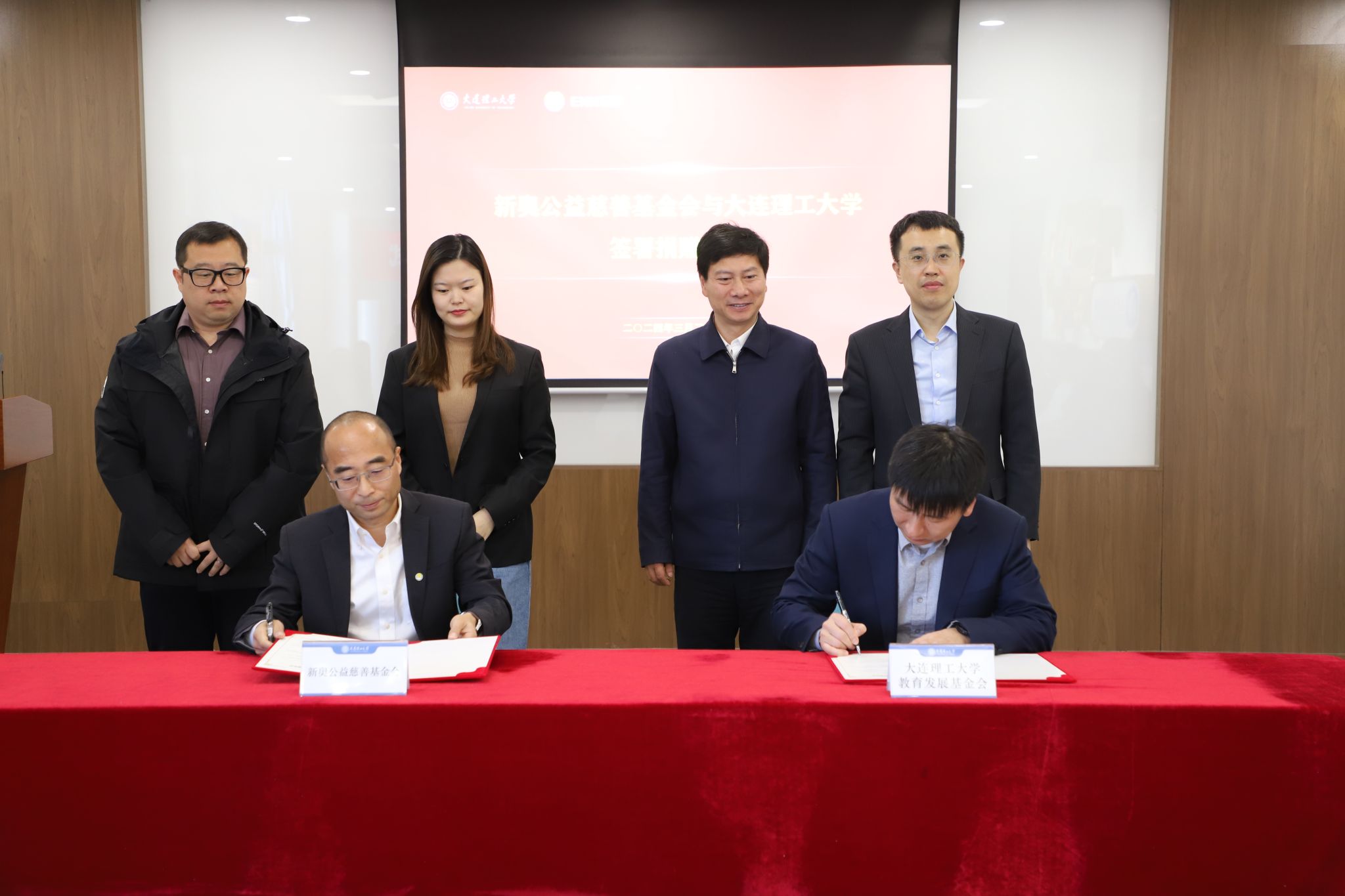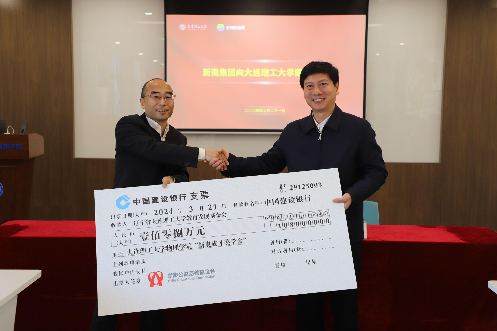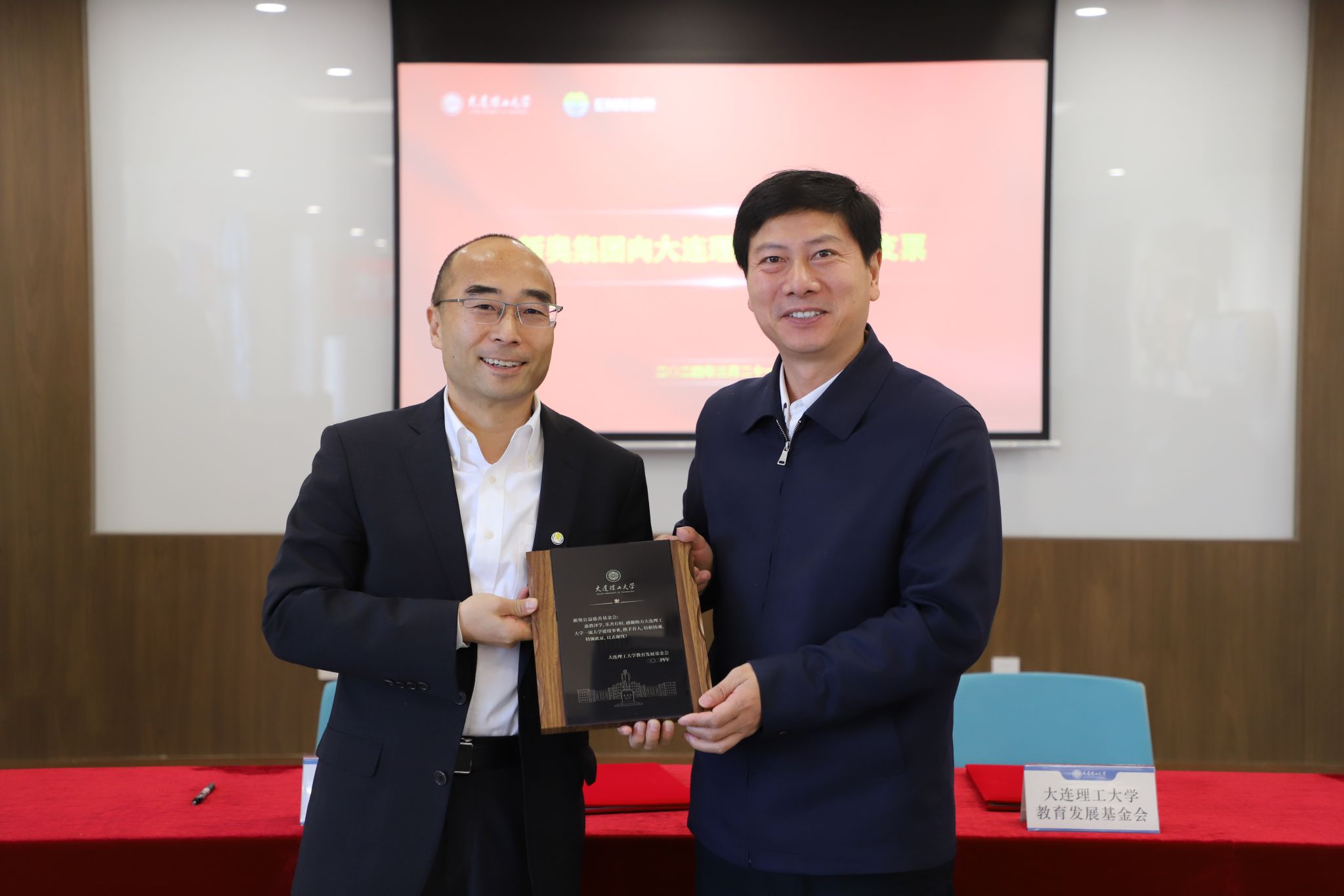 新奥能源研究院院长、聚变研发中心总经理刘敏胜与大连理工大学国内合作与联络处处长杨克旭签署捐赠协议。