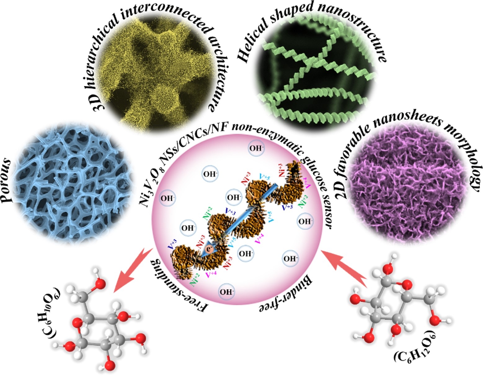 研究人员通过在碳纳米线圈/泡沫镍导电框架上生长了互连自支撑的Ni3V2O8纳米片,制备了新型无粘结剂的三维分级复合电极。这种复合电极不仅具有良好的多孔结构和高电导率,还具有丰富的金属性氧化还原物质和高电化学活性表面积,体现出优异的电化学性能。该传感器具有极快的检测时间,高检测灵敏度,低检测极限,很强的抗干扰能力及良好的长期存储稳定性,并可用于精确监测人体血清中的葡萄糖浓度。