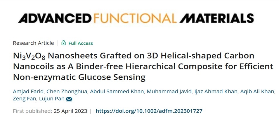 近日,我校乐鱼app官网潘路军教授课题组在高效葡萄糖检测的新型非酶葡萄糖传感器(NEGS)研究上取得突破性进展,相关成果“Ni3V2O8Nanosheets Grafted on 3D Helical-shaped Carbon Nanocoils as A Binder-free Hierarchical Composite for Efficient Non-enzymatic Glucose Sensing”在国际期刊Advanced Functional Materials上发表。研究成果对于定量、可靠的葡萄糖检测、糖尿病管理以及生物技术、制药、食品加工等领域都具有重要意义。