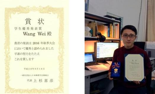 2016年9月13-16日,在日本物理学会(JPS)2016年秋季大会中,三束实验室王正汹教授的博士生王玮获得了本年度日本物理学会优秀发表赏(奖)。日本物理学会创建于1877年,130年间共涌现出11位诺贝尔物理学奖获得者。优秀发表赏(奖)项旨在表彰于物理学各个领域取得突出进展的在读博士研究生,每个领域最终仅遴选出4人。本届大会共有超过5000名参加者,会议报告及展板总计3600余件。评奖过程首先由会议期间通过不记名投票对1000余场报告进行初选,并最终送于会议组委会通过讨论产生。王玮同学还被邀请参加了获奖后由日本物理学会主办的恳谈会(宴会活动)。本次王玮获奖是该奖项在近三年内唯一一次由中国人获得。