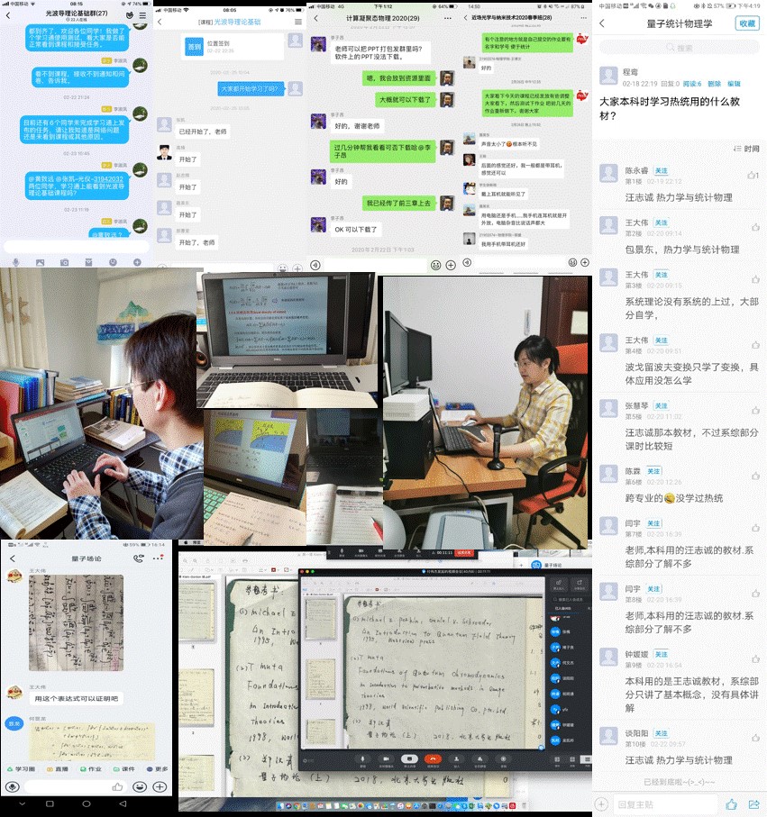 线上教学时间紧、任务重,学院全体开课教师和研究生迎难而上,以饱满的热情投入其中。任课教师积极探索多种线上教学的方法,利用钉钉、学习通等教学平台,采用直播教学、录播教学、布置课后作业,发布讨论课题等多种手段保障教学效果。同时,100%课程建立学生微信群,QQ群,全天在线答疑,及时解决学生学习中的各种问题,提高学生自主学习的积极性。为达到最佳的教学效果,有的老师自购设备,有的老师为抗干扰深夜录课。学生们也纷纷表示,在线上课是对自己自主学习能力的一次全面考验,虽然不能跟任课老师面对面交流,但用班级微信群,QQ群完全没有降低交流质量。完全可以跟上教学内容,通过反复观看,线下提问,能够做到对课堂教学内容的充分理解。例如:学院付伟杰教授主讲的研究生课程《量子场论》就是一个鲜明的例子,《量子场论》在钉钉视频会议网络平台上开课,课程的授课对象本来只有10多名理论物理专业的研究生,通过线上教学模式,还吸引了很多大四的本科生、甚至若干外校的学生,最后班级人数达到了50余人。付教授表示虽然是线上授课,但是教学过程中老师和学生的互动并没有受到影响,大家的讨论反而更多了,并且课后学生还可以回放课堂视频,加深理解。