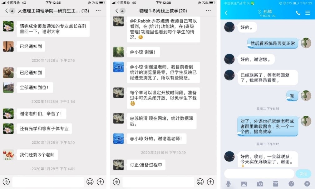 根据学校研究生院工作安排,为确保教师和学生适应线上教学新模式,学院研究生工作组早早复工,利用QQ群、微信群等方式,一方面引导任课教师充分利用信息化手段、强化线上课程统筹规划、组织全体研究生课程任课教师学习在线教学平台和工具,加强线上教学指导、过程监督和远程督导工作;另一方面,细化工作分工,采用二级学科点负责制等方式,全力保障信息上传下达,做到线上教学通知零遗漏,督促所有研究生提前做好线上开课学习的准备工作,保证全部研究生按时进入线上课堂学习。