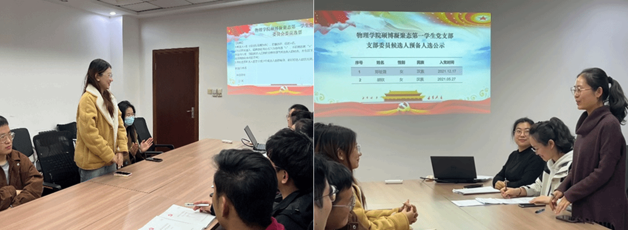 会议第二项,进行支委会换届。支部部分党员因毕业原因无法继续担任支部委员,现支部委员会空缺委员1名。本次有选举权的到会人数超过应到会人数的五分之四,符合开会要求。根据乐鱼app官网党委批复和大会日程安排,硕博凝聚态第一学生党支部召开补选支部委员党员大会。首先由王瑞腾同志宣读补选办法,接下来推选监票人与计票人,推选结果是分别由李希娜同志与刘鹏辉同志担任监票人和计票人;随后由支部委员候选人介绍自身基本情况并进行竞选发言;最后经全体参会党员通过无记名投票,郑祉溦同志当选为硕博凝聚态第一学生党支部委员会委员。
