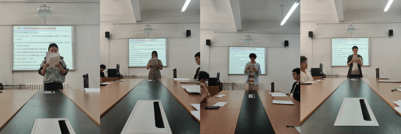 会议第二项,讨论接收罗倩、刘莹莹、陈星宇以及孙本意四位发展对象为预备党员的事宜。首先,四位同志分别宣读入党志愿,向党组织报告个人基本情况、入党动机、对党的认识、自身优缺点以及未来发展方向,并表明入党决心。接着,由入党介绍人分别发表意见,并对其能否入党表明态度。组织委员王鹏宇同志代表支委会向大会报告了几位同志的政治审查情况;与会党员对几位同志的现实表现进行了客观评价。经过大会充分讨论后,采用无记名投票方式进行表决,与会党员一致同意接收罗倩同志、刘莹莹同志、陈星宇同志以及孙本意同志为中共预备党员。在入党介绍人的带领下,四位同志进行庄严宣誓。