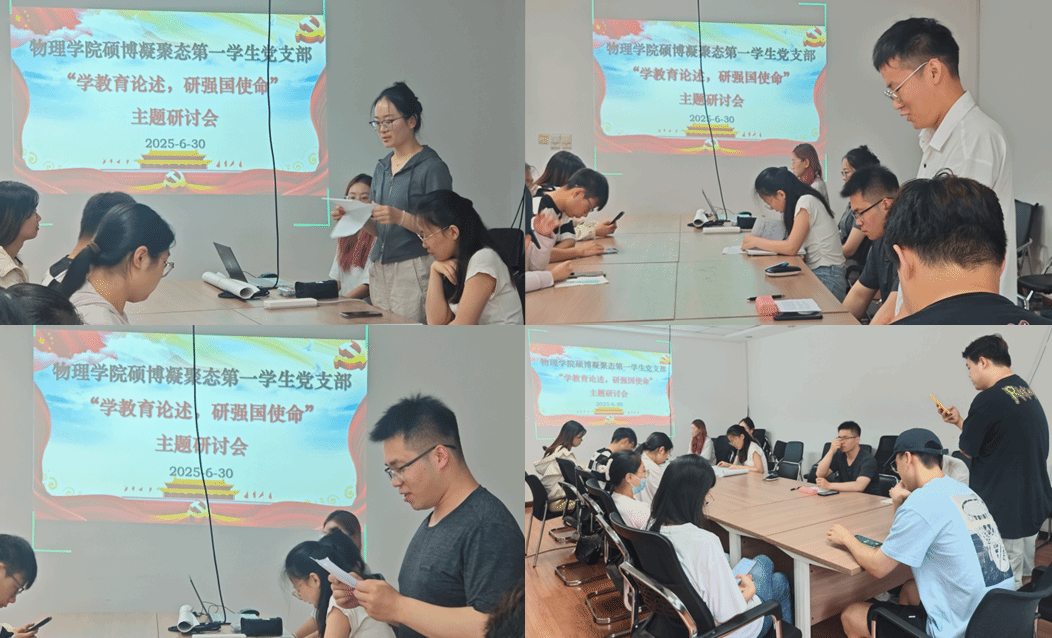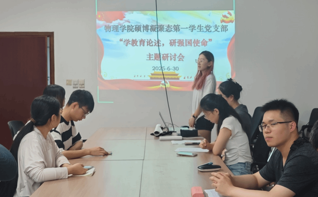 为巩固党员集中学习成效,准确把握习近平总书记关于教育的重要论述精神,同时庆祝中国共产党成立104周年,2025年6月30日上午10点,乐鱼app官网硕博凝聚态第一学生党支部在科技园C座510会议室开展主题党日活动暨党员集中培训主题研讨会,会议由党支部书记郑祉溦同志主持,党支部全体党员参会。