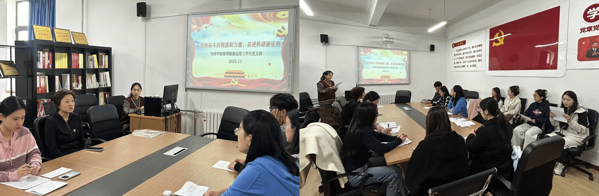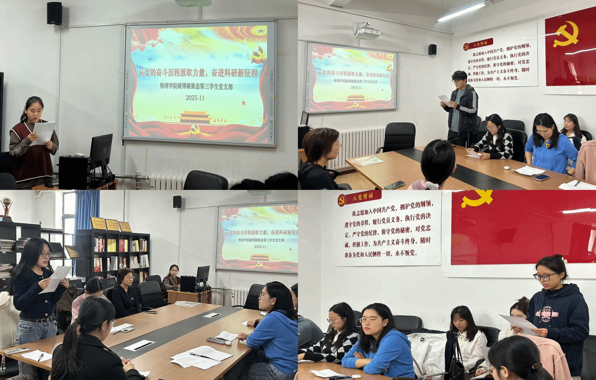为深入学习贯彻党的二十届四中全会精神,全面加强新时代高校党员的理论武装,切实用习近平新时代中国特色社会主义思想凝心铸魂,11月6日上午10点,乐鱼app官网硕博凝聚态第三学生党支部在物理楼422会议室开展“学思明志强信念,科研报国担使命”主题党日活动暨第二次党员基本培训交流研讨会。会议由党支部副书记李柠同志主持,乐鱼app官网党委副书记兼纪委书记于艳敏老师莅临指导,党支部全体党员参加。