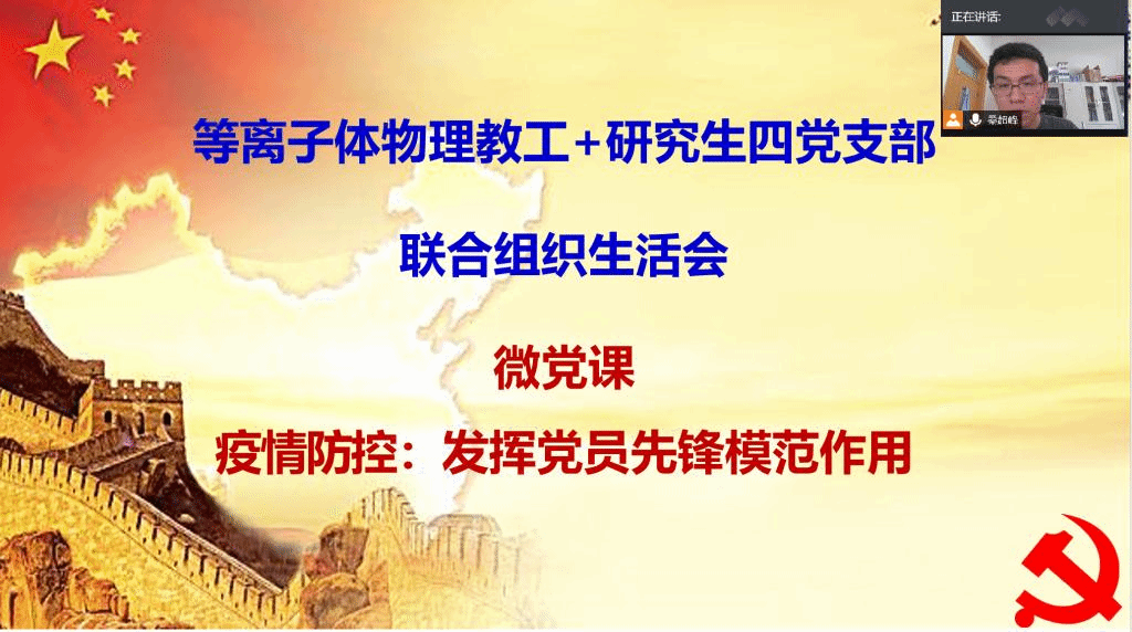 为庆祝建党99周年,响应校级党组织“四个一”活动安排,在全校研究生复学之际,结合“习近平总书记关于疫情防控重要讲话和指示批示精神”和“有序推进学校复学复课要求”,2020年6月23日下午,乐鱼app官网等离子体教工党支部联合等离子体物理研究生三个党支部联合召开“迎党的生日、讲战疫故事、悟初心使命”组织生活会暨《发挥党员的先锋模范作用》疫情防控微党课。这是等离子体教工党支部与研究生党支部首次联合开展组织生活会,四个支部近70名师生参加会议。研究生党员克服刚刚返校、旅途劳顿等困难,积极参与组织生活。会议通过腾讯会议在线召开,由等离子体教工党支部书记桑超峰同志主持。