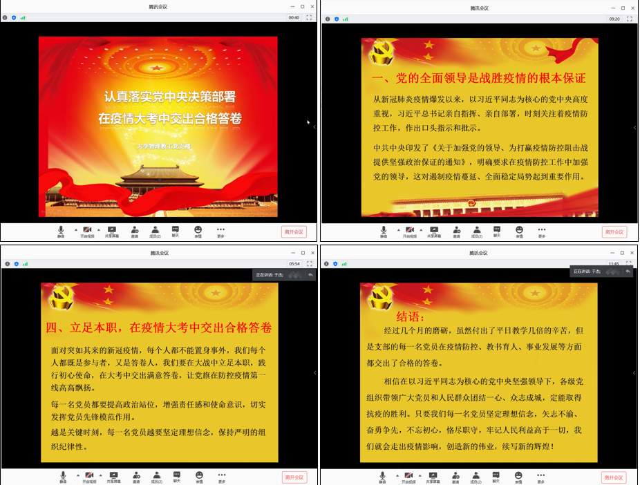 于杰同志针对疫情防控做专题微党课《在疫情大考中交出合格答卷》,带领支部党员同志紧密围绕习近平总书记关于疫情防控重要讲话和指示批示精神,从党的全面领导是战胜疫情的根本保证;社会主义制度是坚持全国一盘棋、集中力量办大事的制度优势;面对疫情,共产党员充分发挥了先锋模范的“硬核”作用三个方面带领支部党员同志展开了深入的学习。同时,于杰同志结合大学物理教学中心疫情期间面对“停课不停学”的挑战,教学新理念、新方法、新经验的积累进行了汇报。