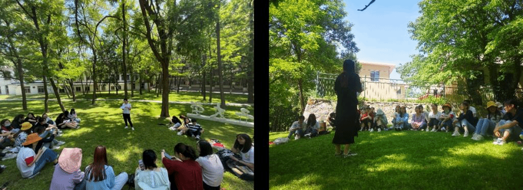 活动在学院东侧的草坪上举行,树荫下近40名同学围坐一圈。活动首先由8名党员、团员分享关于毛泽东、周恩来、邓小平、刘少奇等共和国领袖的党史故事,带领大家领略这些享有崇高威望的卓越领导人、久经考验的共产主义战士们的胆略和睿智。