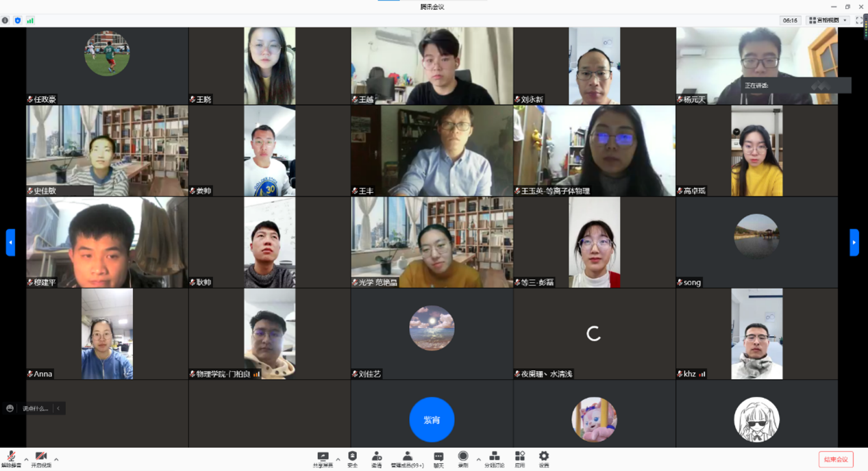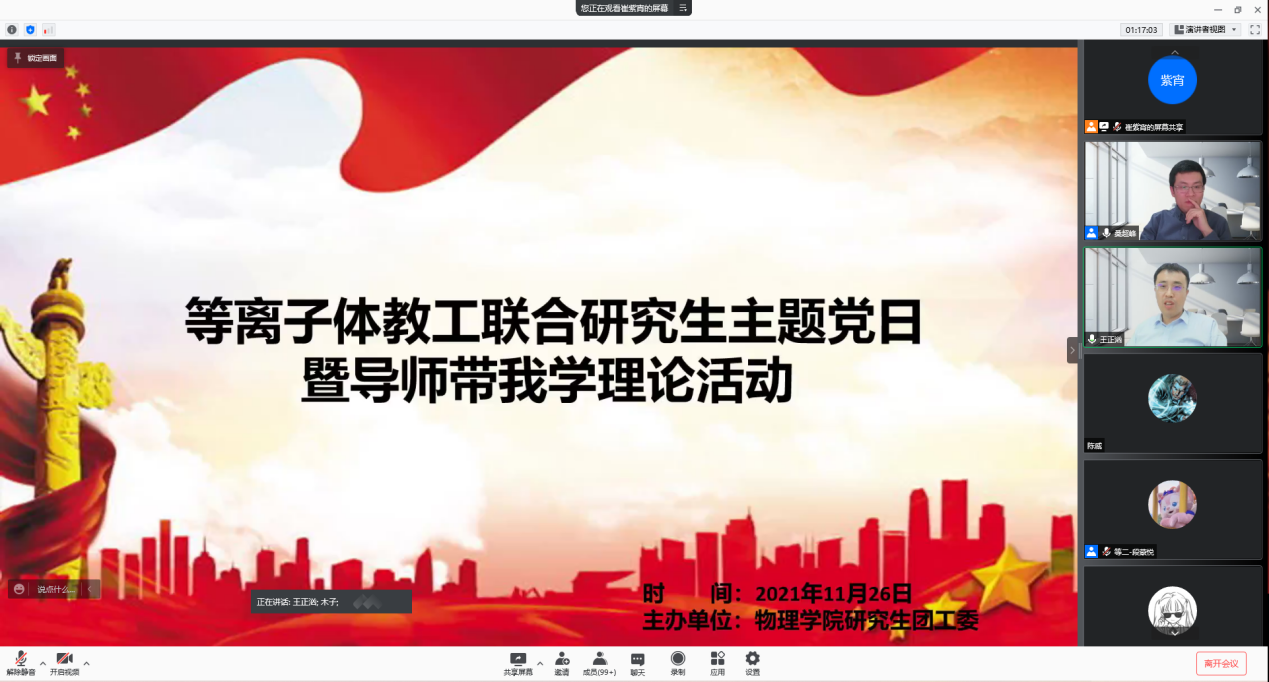 为响应学院党委关于加强深入学习党的十九届六中全会精神要求,发挥基层党支部宣传群众职能。同时为及时了解并解决疫情期间研究生遇到问题,2021年11月26日,乐鱼app官网等离子体物理教工和硕博学生党支部通过腾讯会议开展了以学习党的十九届六中全会精神和解决疫情“封校”期间问题的联合主题党日活动。等离子体物理教工党支部书记桑超峰教授讲解了党的十九届六中全会的主要内容并和相关精神,三名等离子体学生党支部书记对疫情期间研究生心理、科研等方面存在的问题进行反馈,乐鱼app官网党委书记王正汹教授、副院长高飞教授等对疫情封校后同学们反映的所遇到的问题予以解答并提出应对方法。活动受到老师同学积极响应,共有187人参会,其中老师25人,学生162人。