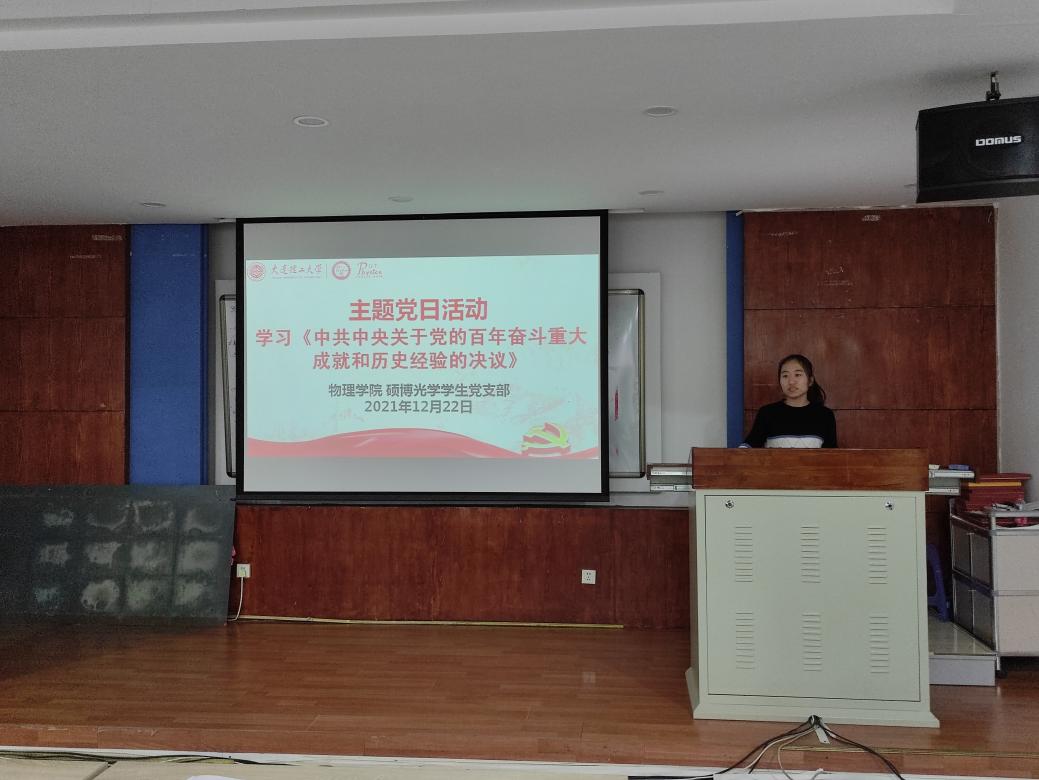 党的十九届六中全会,是在建党百年之际、在“两个一百年”奋斗目标历史交汇点上召开的重要会议,全会审议通过了《中共中央关于党的百年奋斗重大成就和历史经验的决议》,发出新时代中国共产党人牢记初心使命、坚持和发展中国特色社会主义的政治宣言。为深入学习贯彻党的十九届六中全会精神,深刻领会《决议》精神,强化支部全体党员的政治责任感和历史使命感,乐鱼app官网硕博光学学生党支部于2021年12月22日在物理楼322会议室开展“学习《中共中央关于党的百年奋斗重大成就和历史经验的决议》”主题党日活动,支部全体党员参与活动。