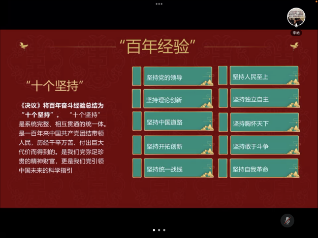 会议第一项是学习《中共中央关于党的百年奋斗重大成就和历史经验的决议》。会前支委会已经将相关学习材料发给党员们自行学习,会中李皓同志和大家一起回顾了相关内容。《决议》主要总结党的百年奋斗重大成就和历史经验。这些经验饱含着成功和失败,凝结着鲜血和汗水,充满着智慧和勇毅,是历史发展的结果、历史实践的产物、历史奋斗的结晶,是历史规律的昭示。这些经验是我们党弥足珍贵的精神财富,更是我们党引领中国未来的科学指引。