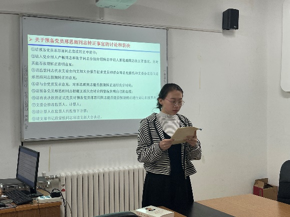 会议第五项,讨论关于付艳艳、邢思雨、黄实中三名同志转为正式党员的问题。会议严格按照规定程序进行。首先,付艳艳、邢思雨、黄实中三位同志依次宣读转正申请书,汇报了自己这一年的预备期中学习、生活、工作、思想等方面的情况,并表明了按期转正的热切期望。入党介绍人介绍了三位同志的主要情况,并对其能否按期转正表明意见。随后,支部组织委员温慧同志代表支委会向大会报告对以上三位同志的审查情况。与会正式党员对三位同志能否如期转正进行了充分讨论。最后大会进行投票表决,与会人员全票通过三名预备党员的转正申请,并由支部书记段蒙悦同志宣读支部大会决议,同意三名预备党员按期转正。