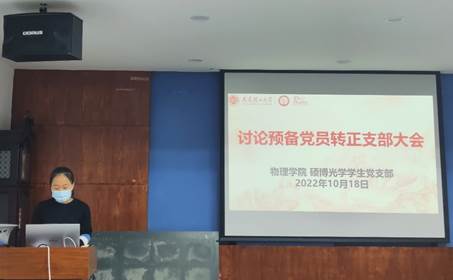 2022年10月18日下午18:30,乐鱼app官网硕博光学学生党支部在物理楼322会议室召开了预备党员转正支部大会并开展理论学习,会议内容包括对高楠等四位预备党员的转正问题进行讨论以及集中学习《习近平谈治国理政》第四卷。支部全体在校党员参加,尚未返校的党员同志通过腾讯会议线上参加,会议由党支部书记陈中华主持。