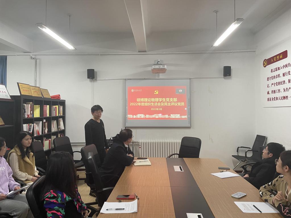 根据学校党委《关于召开2022年度基层党组织组织生活会和开展民主评议党员的通知》和学院党委的部署安排,支委会为更好开展组织生活会和民主评议党员相关工作进行精心准备,会前,支部围绕《学习党的二十大精神,正确理解中国式现代化》的主题党课教育,为开展好组织生活打下思想基础。硕博理论物理学生党支部2022年度组织生活会和民主评议党员于2023年3月2日晚7点在422会议室采取线上与线下相结合的方式进行开展。本次会议的主要内容有两部分,党课集中学习与组织生活会和民主评议党员。其中,集中学习围绕深入贯彻党的二十大精神和毛泽东同志“向雷锋同志学习”题词发表六十周年来开展。本次会议由支部书记刘玉强同志主持,乐鱼app官网副院长于长水同志出席会议,支部全体党员参加。