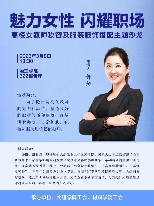 为庆祝“三八”国际妇女节,增加女教职工会员职业幸福感,乐鱼app官网工会联合材料学院工会组织了一次主题为“魅力女性,闪耀职场”的服饰搭配讲座沙龙活动。本次讲座旨在为两学院广大女教师提供一个学习交流的平台,让各位女教师更好地了解妆容及服装服饰搭配技巧,提高自身形象和气质,更加自信地展现自己的风采。讲座活动邀请了大连工业大学服装学院的许阳副教授。许阳老师在服装设计和搭配方面有着丰富的经验和独到的见解,专业能力得到了社会的广泛认可。在活动筹划期间,两院工会面向女教职工会员进行了线上和线下多种形式的活动宣传。