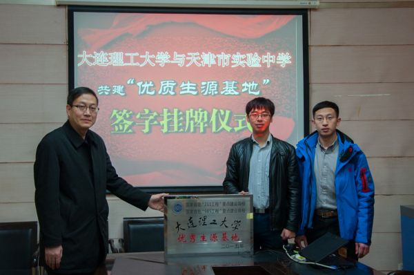 1月20日上午,大连理工大学与天津市实验中学优质生源基地挂牌仪式在实验中学主楼第一会议室召开。天津市实验中学校长杨静武、教务处主任张健出席仪式,我校物理与光电工程学院佟西原、俞洲作为学校招生工作代表为该中学授牌,签订优质生源基地《人才培养合作协议》并向中学赠送纪念品。
