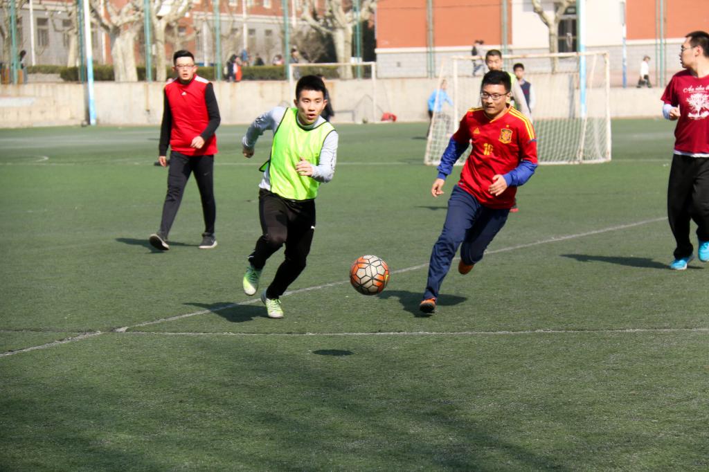 2017年3月12月9:00福佳足球场,物华杯决赛准时开始。虽然天气有点冷,但是丝毫没有影响到大家的热情,此前三战全胜且未失一球的大二A队士气正旺,而大四队则占据着心理和经验上的优势。在主裁黄致远的一声哨响下,比赛正式开始。
