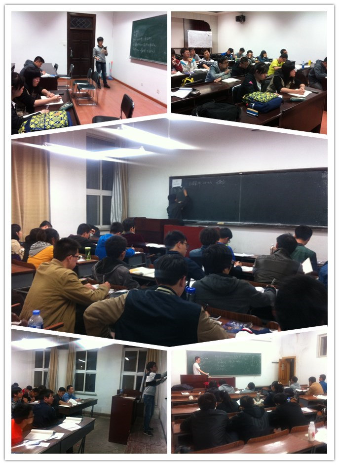 各班级根据自己班的实际情况,邀请自己班级的“学霸”“大牛”为同学们分享学习心得、共享学习资料、讲解重点难点。物科1201班邀请了班级的“学霸”,2012-2013学年学校优秀学生标兵杜石桥同学为大家细致的讲解了目前的难度科目原子物理的学习方法;物理1203班、1204班两班资源共享,一同开展了以寝室为单位的学习经验交流;物理1206班则利用班级自习日,即每周日晚上进行了期中考试动员会……