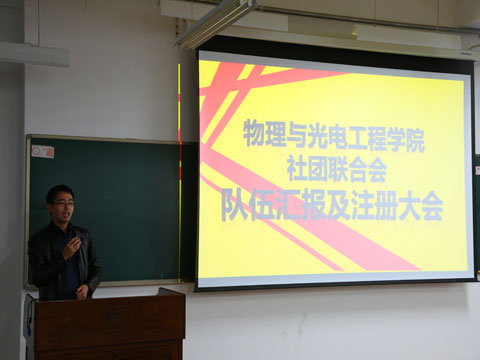 物理与光电工程学院社团联合会队伍汇报及注册大会于12月18日在西部综合楼B106教室召开。校社团联合会指导老师冯丽芳老师,物理与光电工程学院团委书记佟西原老师,校社团联合会副主席郑晶,李冠基,电子信息与电气工程学部社团联合会主席全欣,建设工程与力学学部社团联合会主席耿冲,乐鱼app官网学生会主席兼团委副书记刘聪越,乐鱼app官网团委常务副书记金美晨以及乐鱼app官网团委,学生会,社团联合会的各部长出席会议,由乐鱼app官网社团联合会主席孙长鹏主持会议。