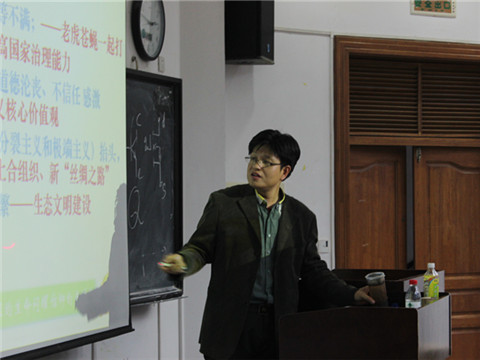 讲座在新生们热烈的掌声中开始。常亮老师首先就“大学生为何要入党”这一问题进行分析。他指出:时下大学生入党俨然成为一种“潮流”。接着,常亮老师从“青年学生的入党动机分析”、“生无信仰心、恒被他笑具”、“最新时事动态解读” 、“如何成就自己的信仰”以及“组织发展入党程序”五部分做了详解。他对当前大学生五种不同的入党动机进行了深入透彻的分析,讲解了信仰的重要性和两种科学解读“共产主义信仰”的方法。又结合“香港占中”、“马航MH 370”等最新时事,从我国当前的国情、不足与矛盾、周边形势、国际形势背景等方面对时事动态进行了解读。而在分析国际形势背景时,常亮老师指出:中美矛盾核心根源在于意识形态之争,本质则是经济利益之争。同时向新生们介绍了入党的流程以及申请入党人、入党积极分子、发展对象之间的区别与联系,并向新生们阐述了入党申请书的一些必要规范和细节。期间、他还为新生们讲述了自己在朝鲜时的见闻,幽默诙谐的语言使学生们多次爆发出热烈的掌声。
