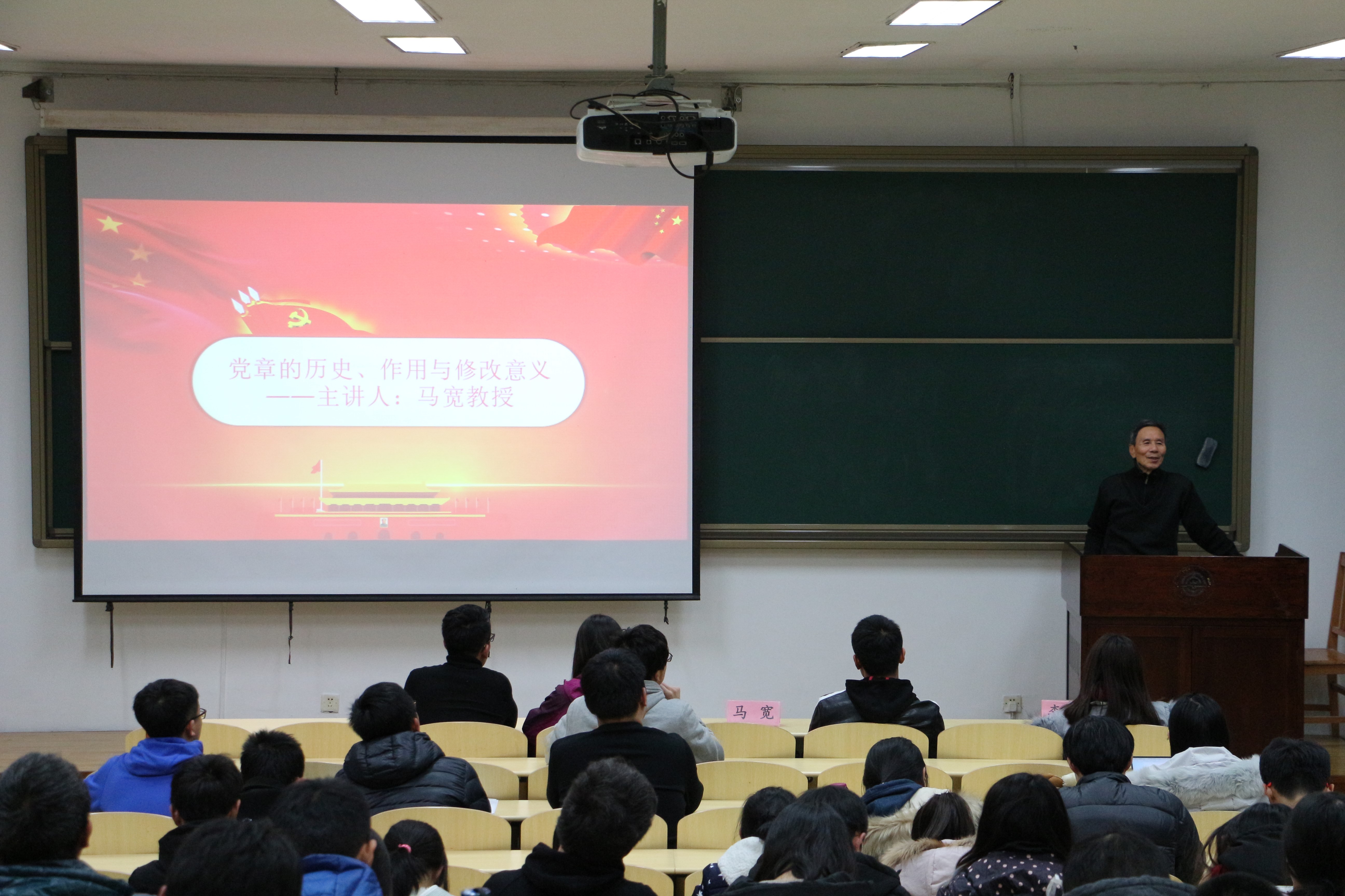 活动在庄严的团歌声中拉开帷幕。主持人向大家介绍十九大报告中的亮点、对党章的修改等内容,引出本次学习的主要内容——十九大报告提出的新矛盾与新思想。十九大报告指出:“中国特色社会主义进入新时代,我国社会主要矛盾已经转化为人民日益增长的美好生活需要和不平衡不充分的发展之间的矛盾。”现场的同学们就这一点分别发表各自的看法,提出自己对于新矛盾的理解。随后,由马宽教授为现场同学们讲解党章的历史、作用与修改意义。马宽教授从历史出发,结合现实生活,从多个角度讲解党章的方方面面,加深同学们对于党章的认识,使同学们对十九大的理解更进一步。进入提问环节,多位同学提出了自己对于新矛盾、新思想的疑问,马宽老师耐心细致地为他们解答,同时也向同学们阐述了自己对这两方面的理解,大家表示受益匪浅。