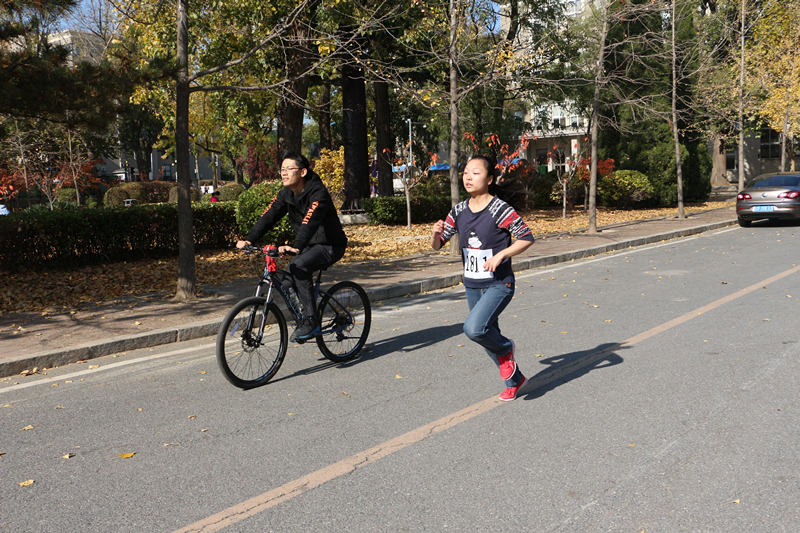赛制为班级一女四男接力跑,比赛过程中由志愿者骑自行车领路,沿途设有路标站点。一切准备就绪后,各班女生首跑,可谓是巾帼不让须眉,每个人都全力以赴,跑出了自己的水平,而男生的竞争更为激烈,在各班加油助威声下你追我赶,互有领先。