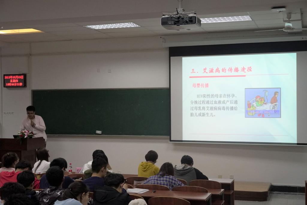 会议开始,伴随着同学们奏唱团歌的结束,首先是刘柏良同学向大家介绍艾滋病。他耐心地向同学们解释艾滋病的患病原理,病毒感染过程,以及艾滋病引起的人体的一系列症状,让同学们对艾滋病有更深一步的了解,知道艾滋病的相关知识和社会的危害性,增强对艾滋病的防患意识。其间,刘柏良同学还结合生动的视频展示,诉说HIV病毒的起源与发展,同学们听得津津有味。