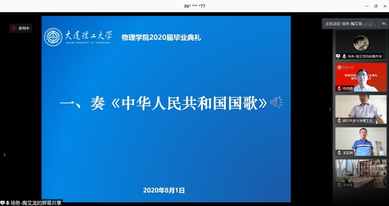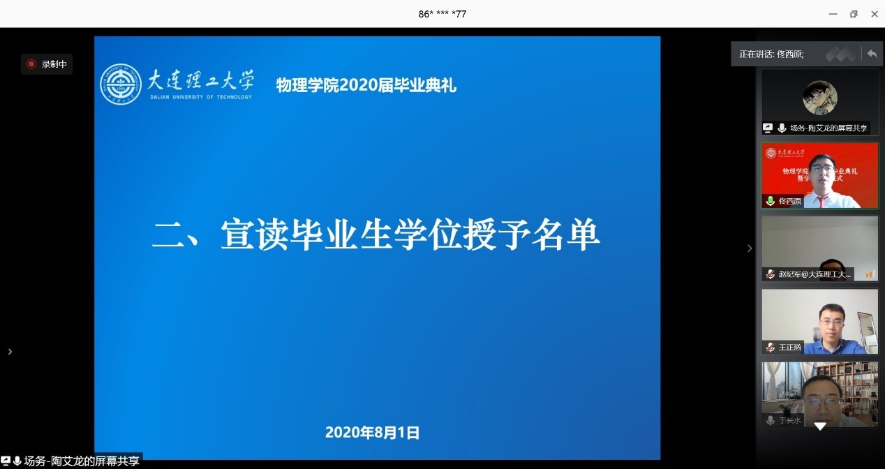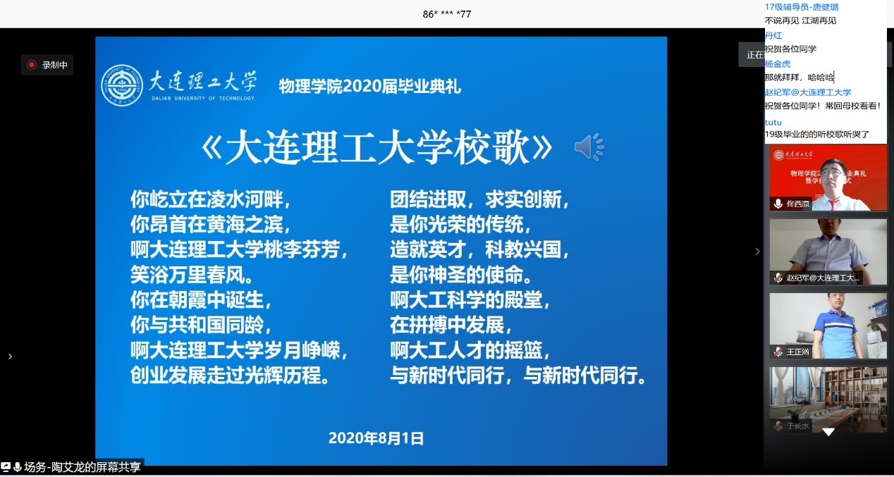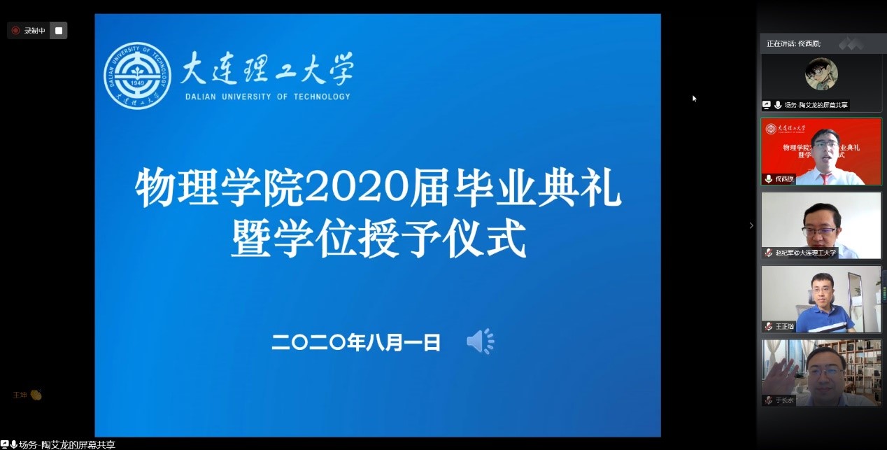 相送情无限,沾襟比散丝。又到一年毕业季,2020届物理学子即将告别亲切熟悉的校园,踏上崭新的人生旅途。2020年8月1日上午10时,乐鱼app官网2020届毕业典礼暨学位授予仪式以网络直播的形式成功举行。出席的嘉宾有乐鱼app官网院长、博士生导师赵纪军教授;党委书记、博士生导师王正汹教授;副院长、博士生导师陈茂笃教授;副院长、博士生导师于长水教授;副院长、博士生导师高飞教授;党委副书记兼副院长于艳敏老师;党委副书记兼副院长、纪委书记周福良老师;学生工作办公室主任、2018级、2019级本科生辅导员纪丹红老师;研究生辅导员张弛老师;2017级本科生辅导员唐健璐老师。此外,本次典礼也面向本科生班主任、全学院的其他老师和同学,毕业生家长们发出邀请。2020届本科毕业生辅导员佟西原老师担任主持人。
