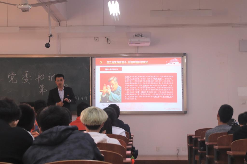 接着,王正汹教授为同学们讲述两弹一星代表人物的故事,中国“光学之父”王大珩、“航天之父”钱学森、“两弹元勋”邓稼先等老一辈科学家“自力更生艰苦奋斗,开创中国科学事业”的精神深深打动同学们,激起同学们成为国家需要的创新型人才的决心。王正汹教授还向同学们详细展示“863”计划以及“9.3”计划的重大成果,给同学们对于我国科技的发展带来极大信心。同时也对同学们提出自己的期望,即把自己的青春投身于祖国新的科学技术发展之中,阐释科学技术是第一生产力,“科学事业建立新功”的硬道理。也说明物理作为基础学科与科学前沿的紧密联系。