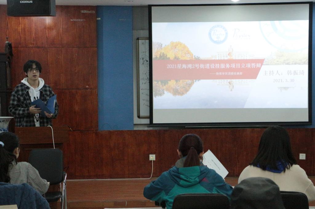 2021年3月30日晚,2021星海湾2号街道社区挂职服务项目立项答辩于物理系楼322室顺利开展。