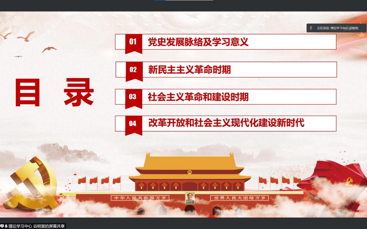 首先,由来自理论学习中心的谷明宣同学带领大家学习党史精神内涵。由党史发展脉络及学习意义,指出了同学们学习党史的必要性。再具体到党史本身,带领同学们分别学习了新民主主义革命时期,社会主义革命和建设时期,改革开放和社会主义现代化建设新时代的重要事件,使同学在具体事例中学习了解党史精神内涵。