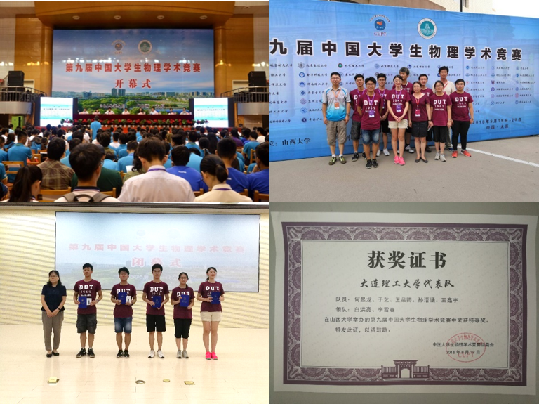 8月15日至20日,由我院何显龙、于艺、孙语涵、王鑫宇、李诗硕、张鹏、乔家鑫7名同学和来自建设工程学部的王品卿同学组成的大连理工大学代表队,在大学物理教学中心(物理国家级实验教学示范中心)主任李雪春教授、白洪亮老师、姜东光教授的带领下,参加了在山西大学举办的第九届中国大学生物理学术竞赛(China Undergraduate Physics Tournament,简称CUPT)。经过五轮比拼,大连理工大学代表队以总分第三的成绩进入决赛并在决赛中名列第二名,最终荣获特等奖。这是大连理工大学代表队自2010年参赛以来首次获得该赛事的特等奖,创造了历史最好成绩。